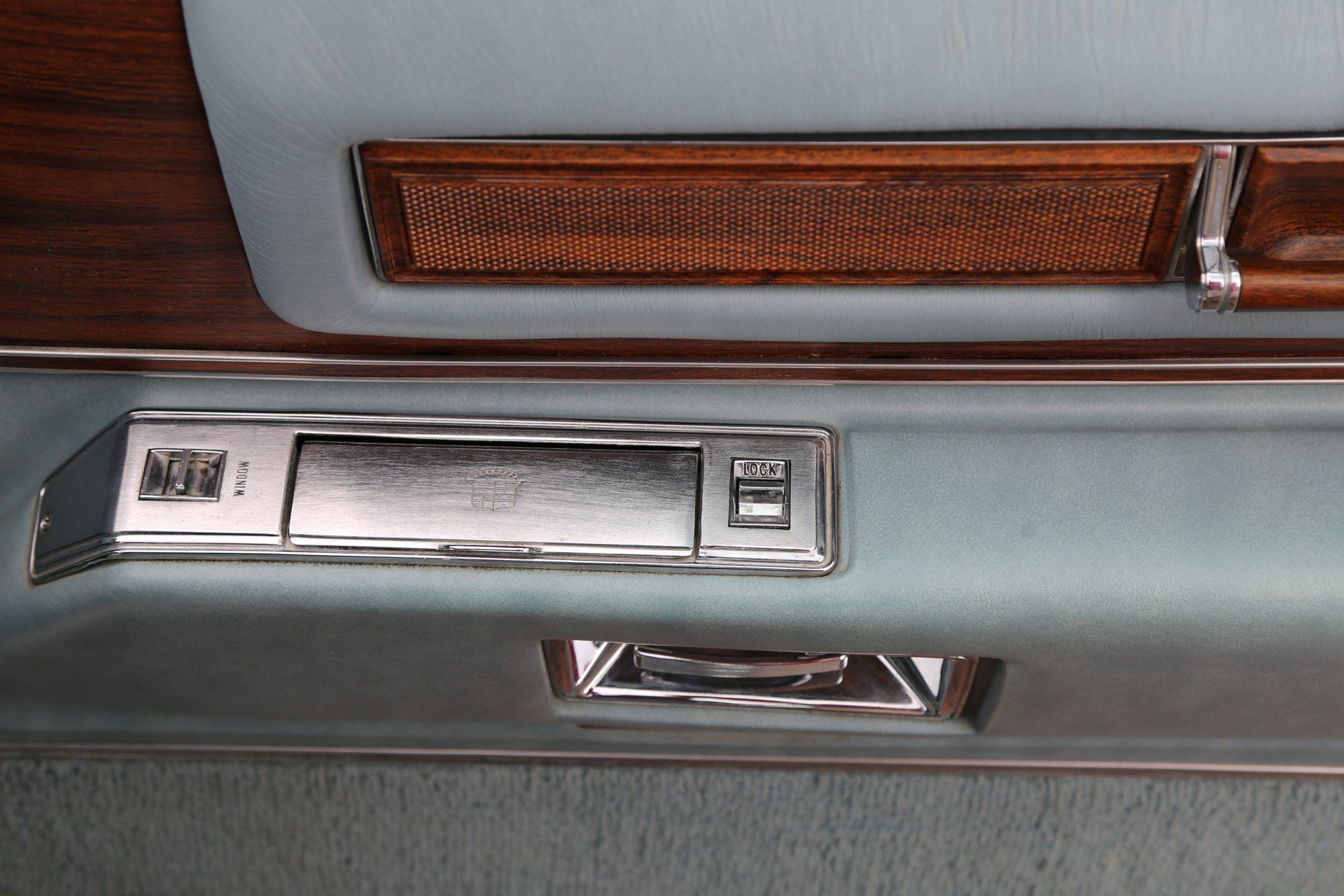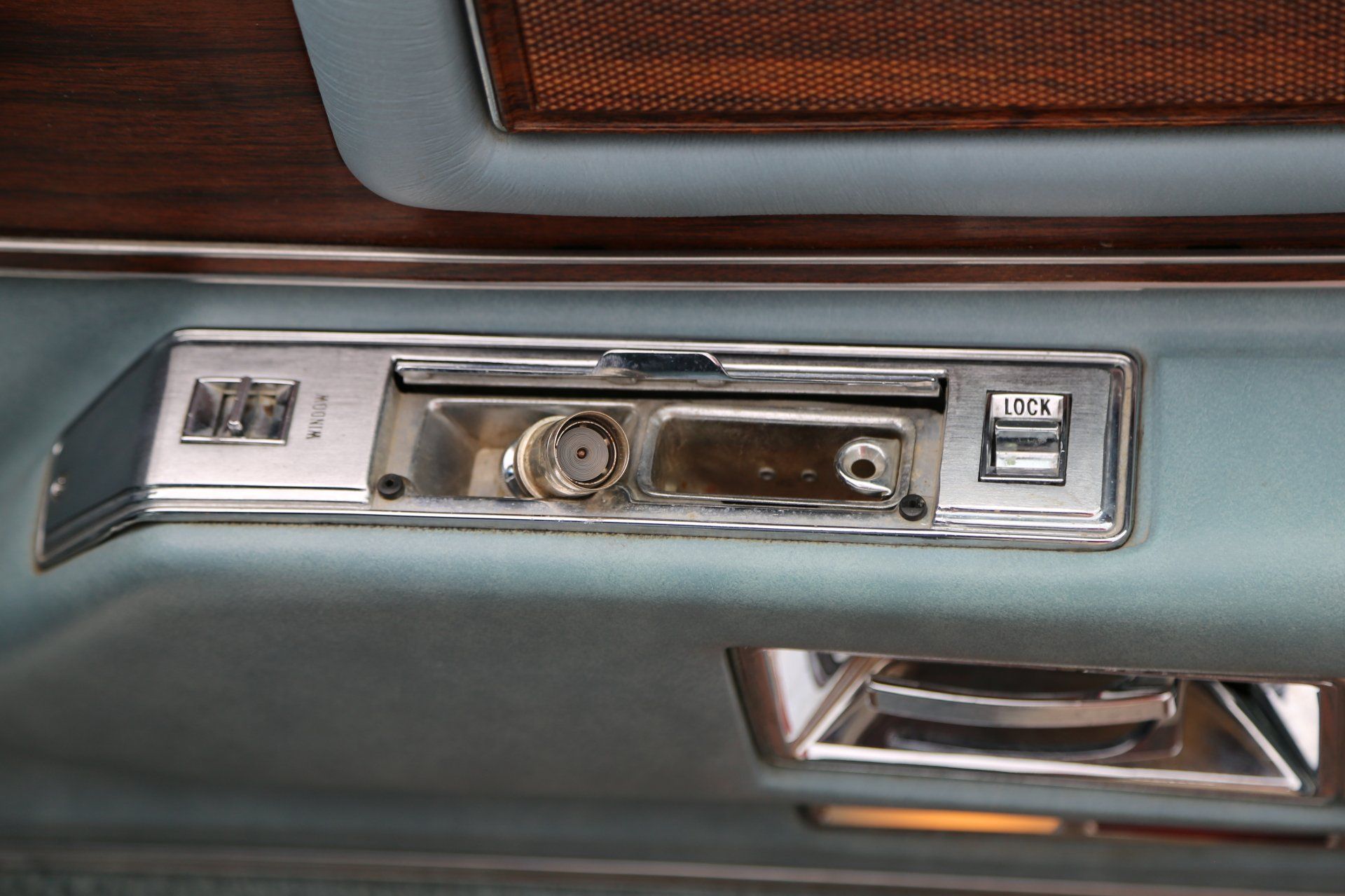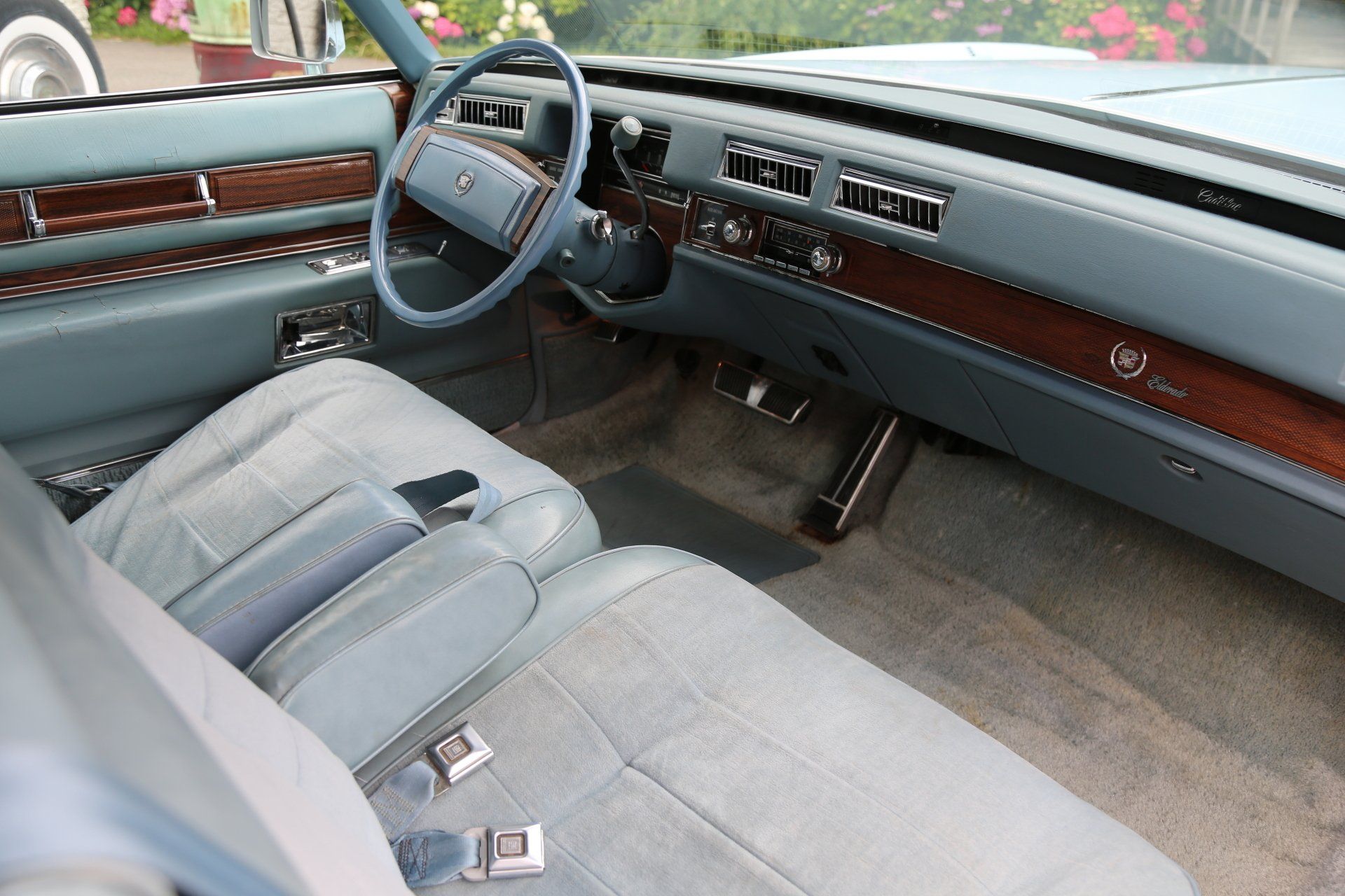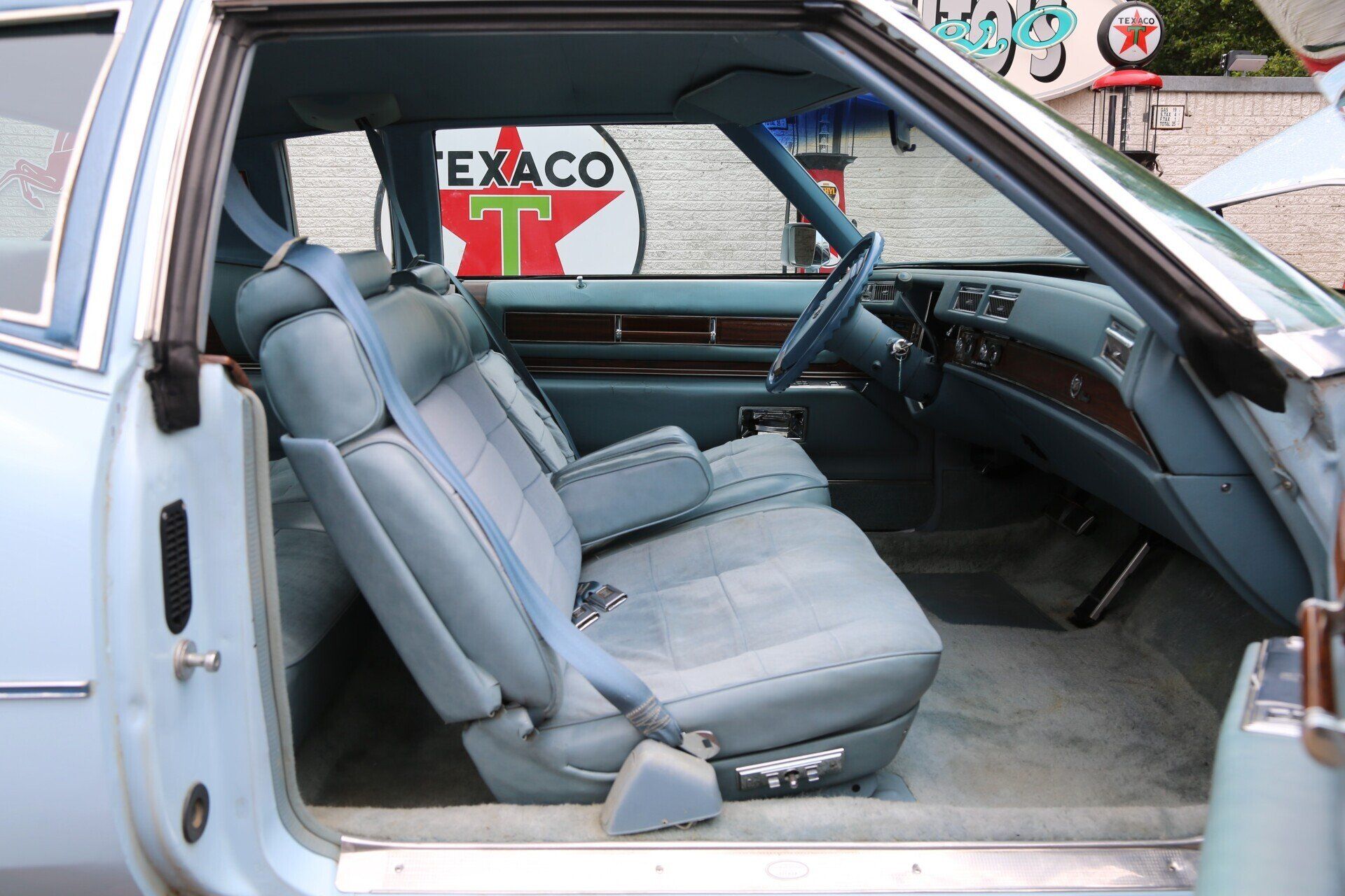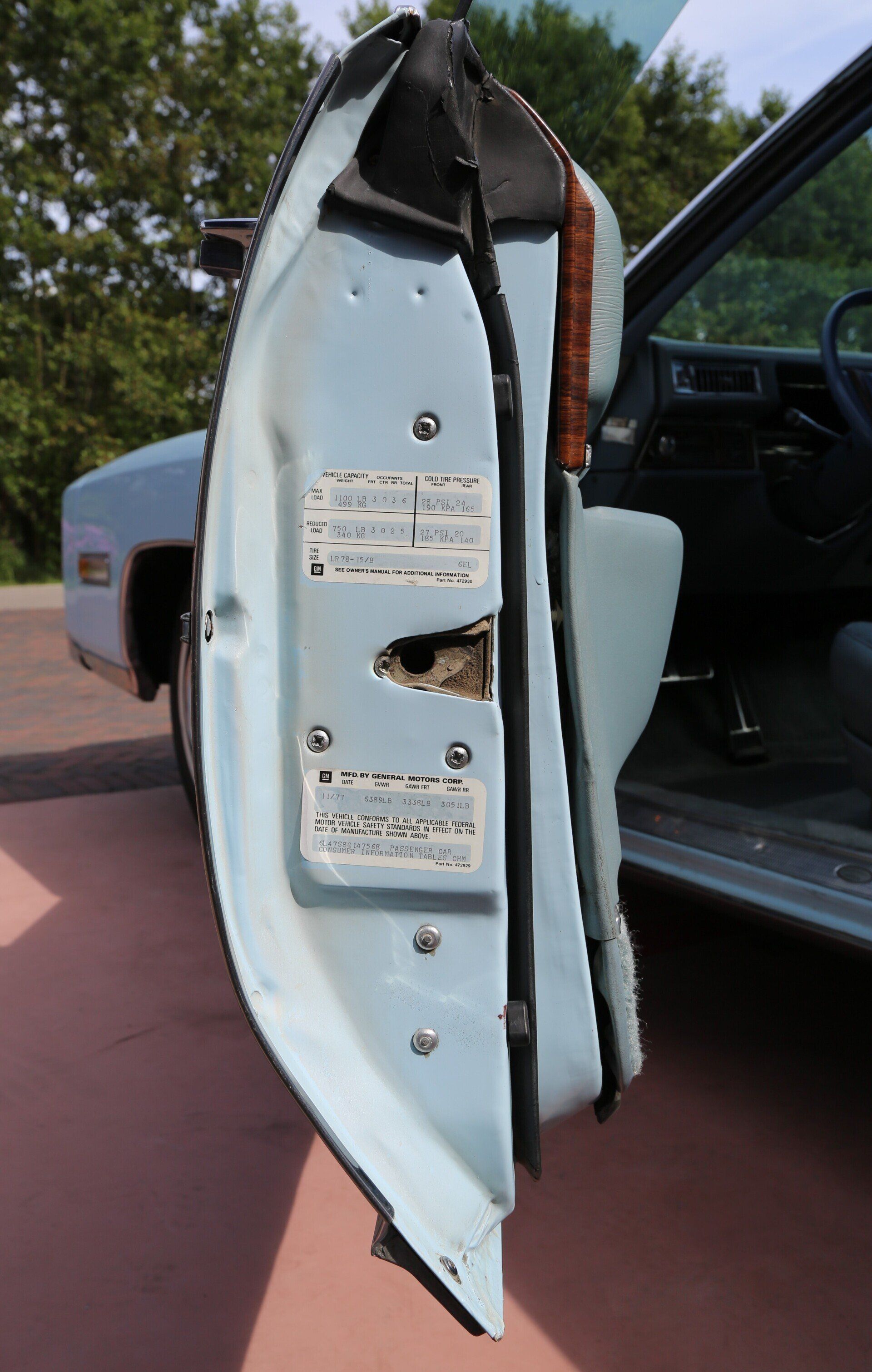 The exterior of this Cadillac has it all: gorgeous lines, a heavily padded landau blue vinyl roof, opera lights, body colored hub caps and elegant white walls to glide this land-yacht on the road. Her opulent-sink-into-interior is still original, and very comfortable. So comfortable you might want to crank up Donna Summer's "I Feel Love" or AC/DC's "You Shook Me All Night Long" just to stay awake. The climate control, 8-Track AM FM with factory CB and power three-way antenna, all work properly. Like so does the power trunk release with the soft close feature!