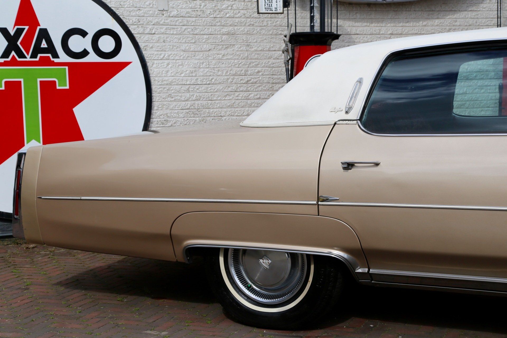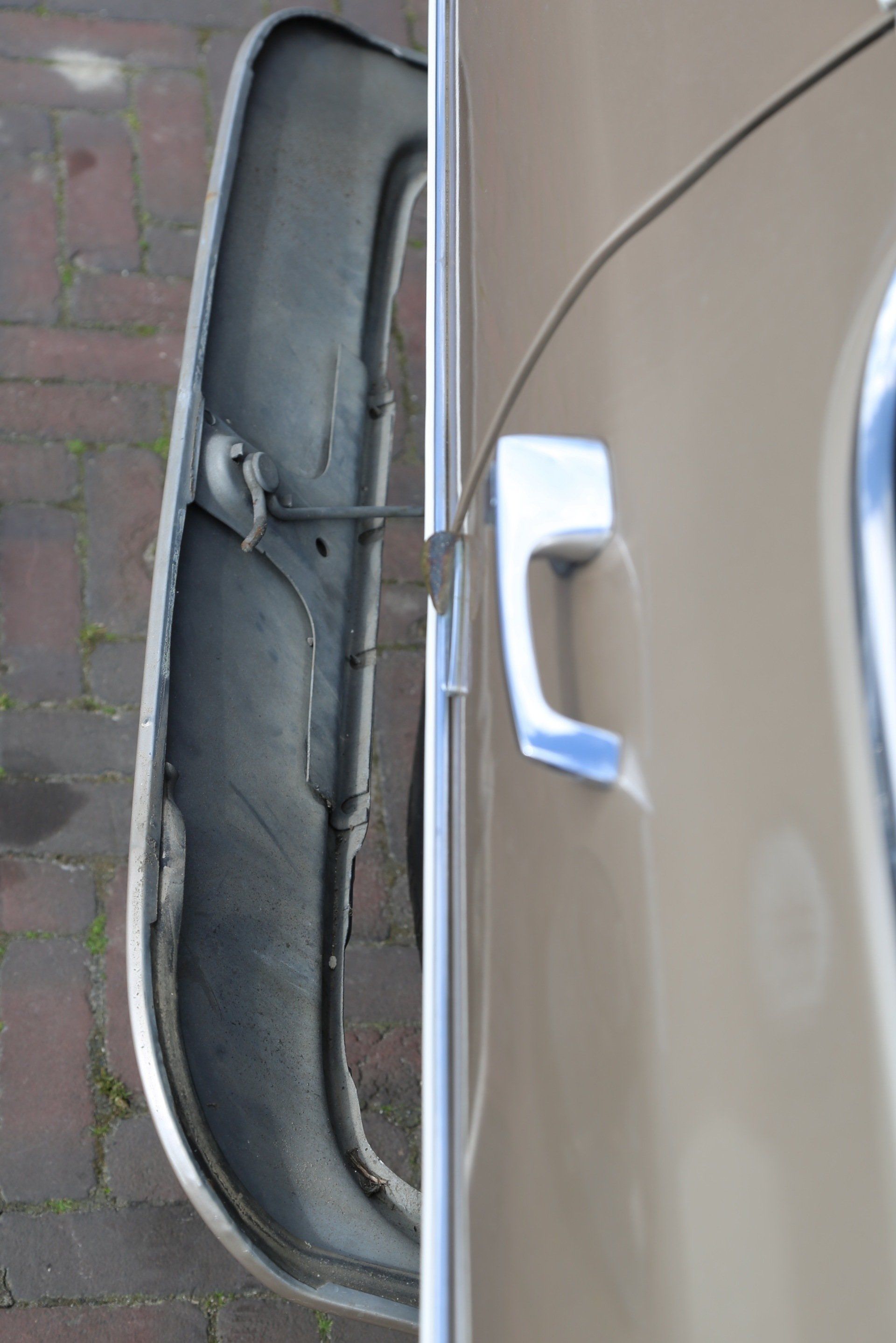 De goudkleurige carrosserie is afgezien van enkele kleine beschadigingen en enkele beginnende roestplekjes in opvallend goede conditie. Ze is dan ook nergens aangetast door ernstige roest. Ook het witte vinyl dak ziet er goed uit. Natuurlijk functioneert alles en glijd deze goudkleurige koets als een zonnetje over het asfalt.