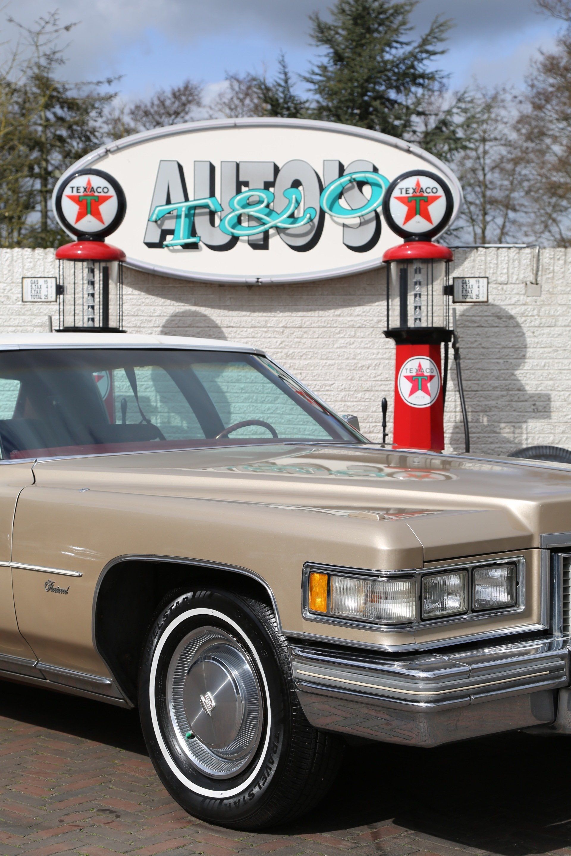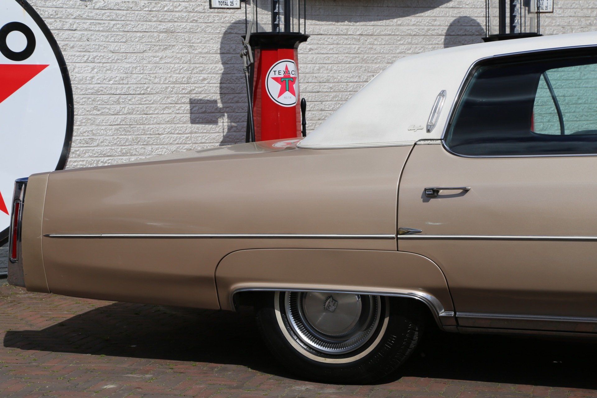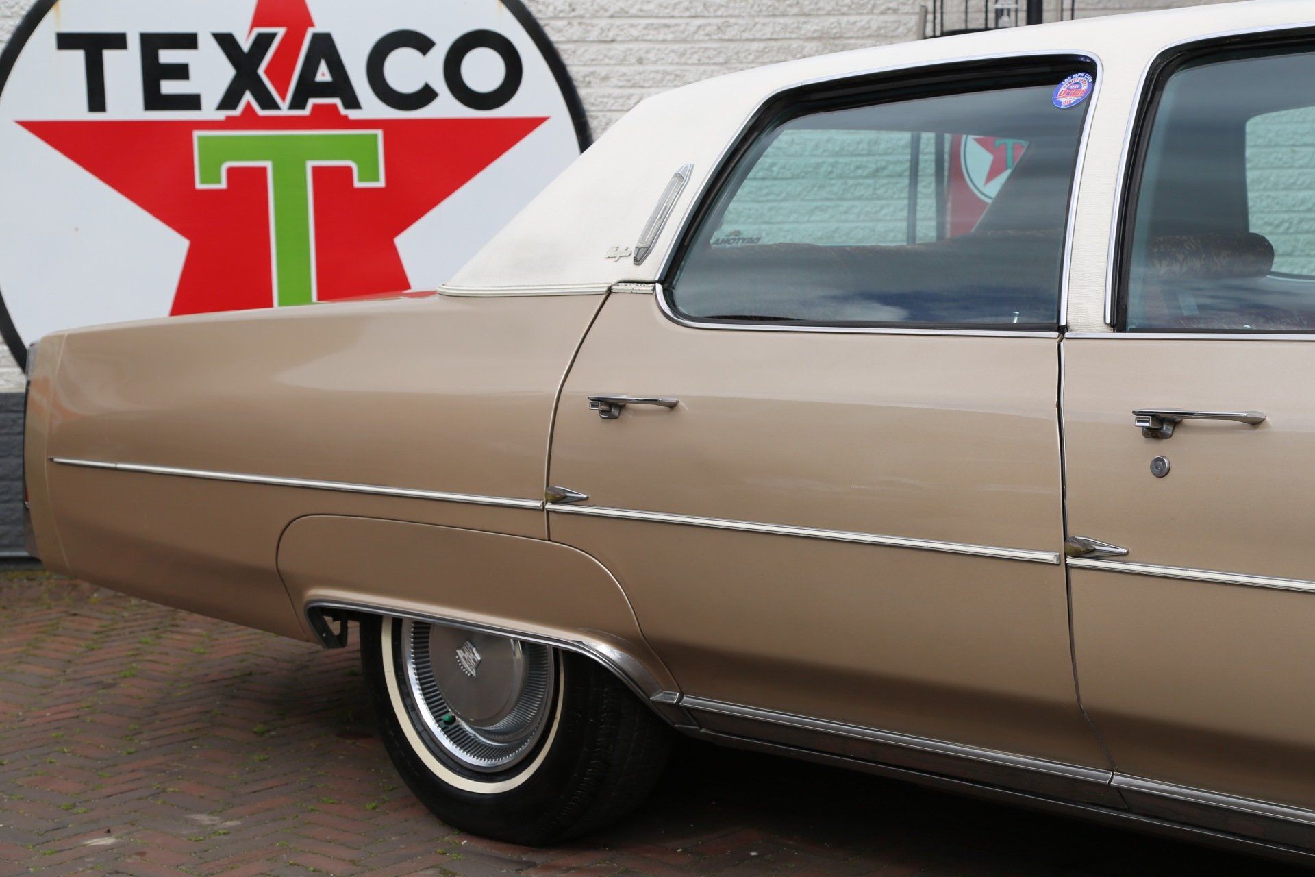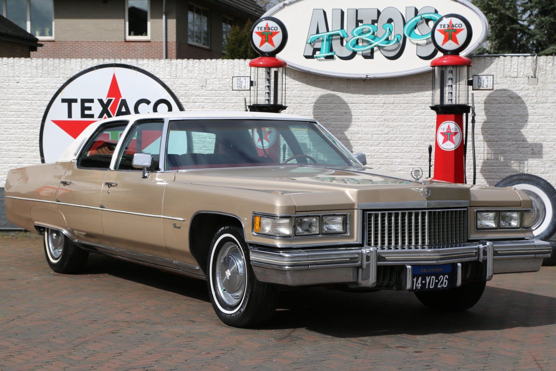 Nee het betreft hier geen tranen trekkende ex begrafenis volgauto, maar een zonnige gouden koets met een fris wit vinyl dak, een echte Amerikaanse slee zoals je ze in de jaren 70 tegen kwam in de USA.