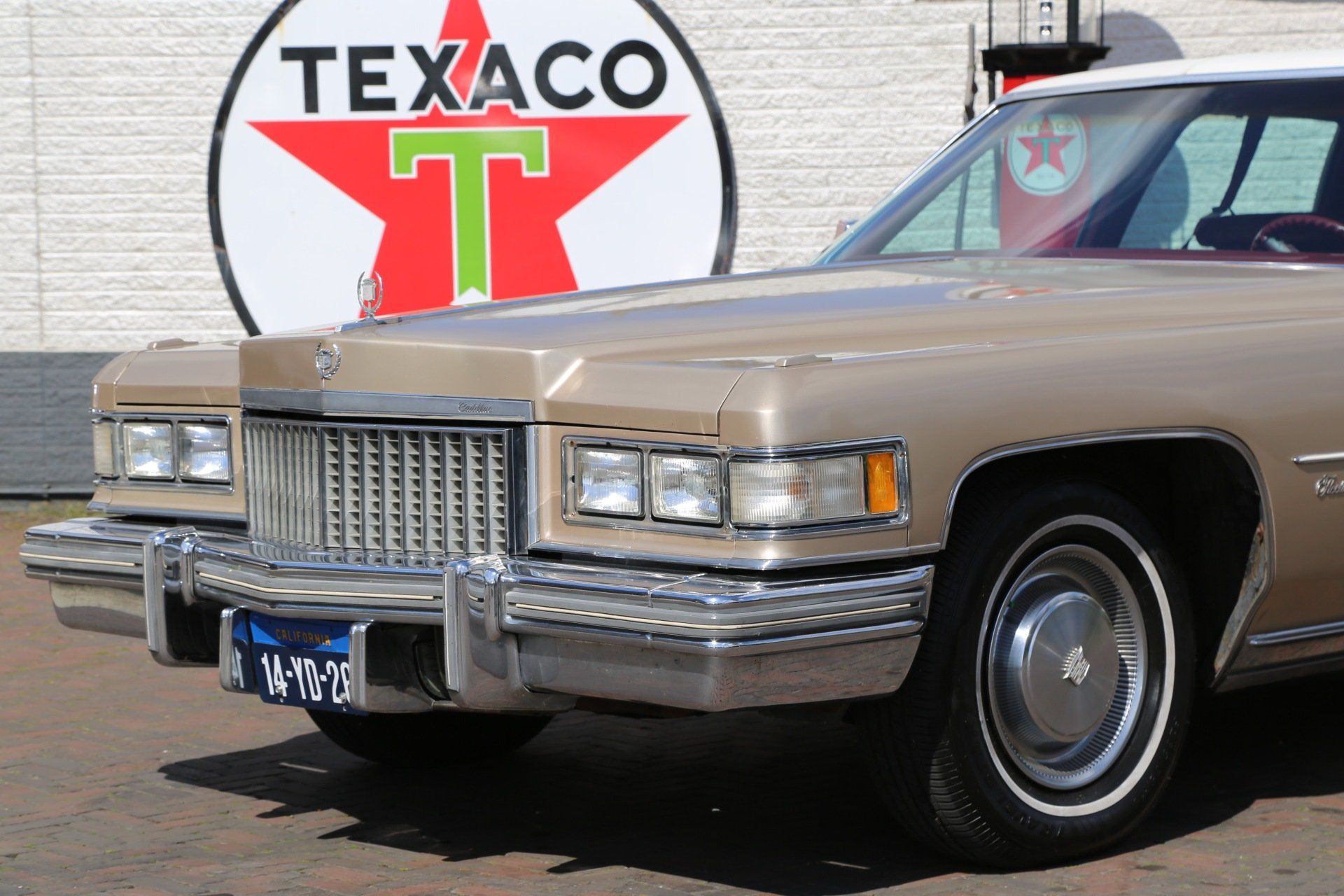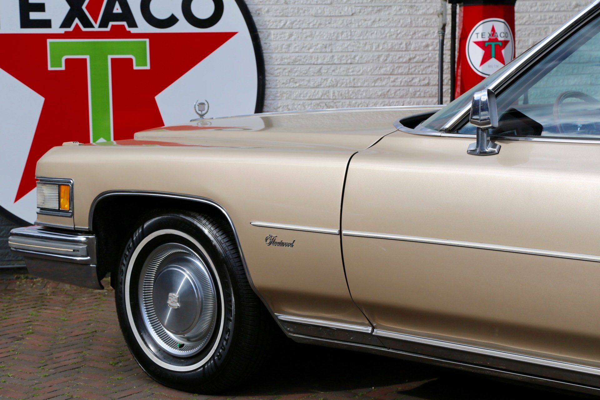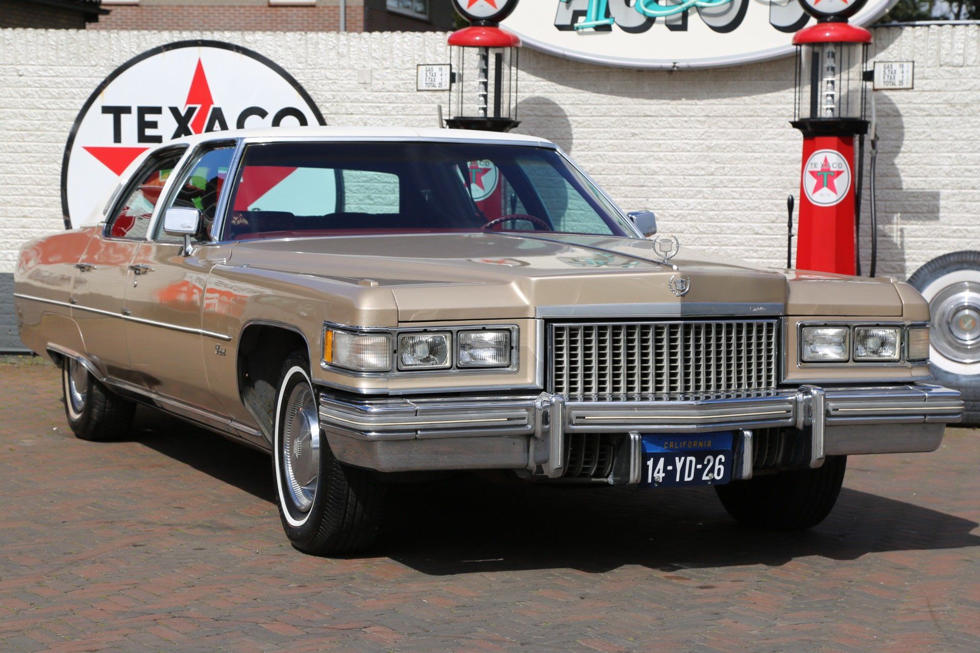 Nee het betreft hier geen tranen trekkende ex begrafenis volgauto, maar een zonnige gouden koets met een fris wit vinyl dak, een echte Amerikaanse slee zoals je ze in de jaren 70 tegen kwam in de USA.