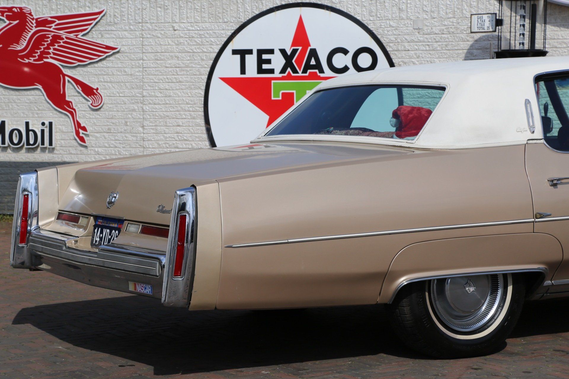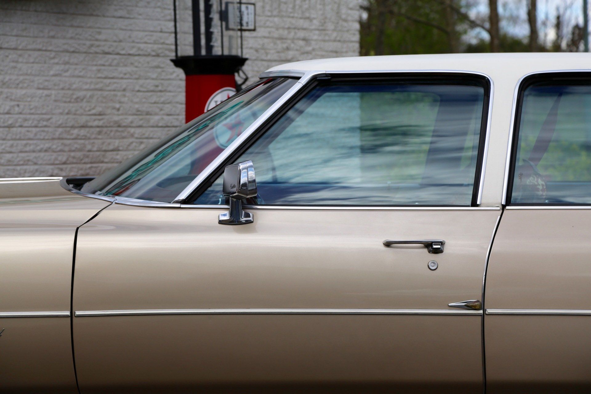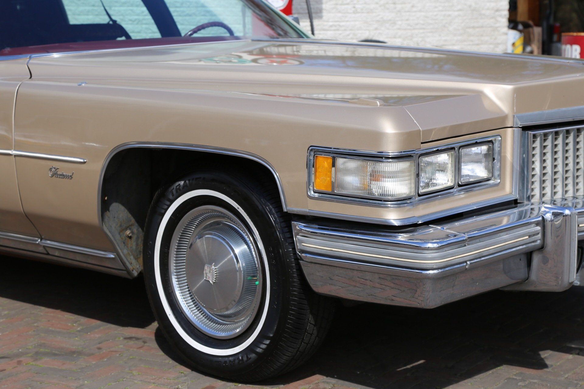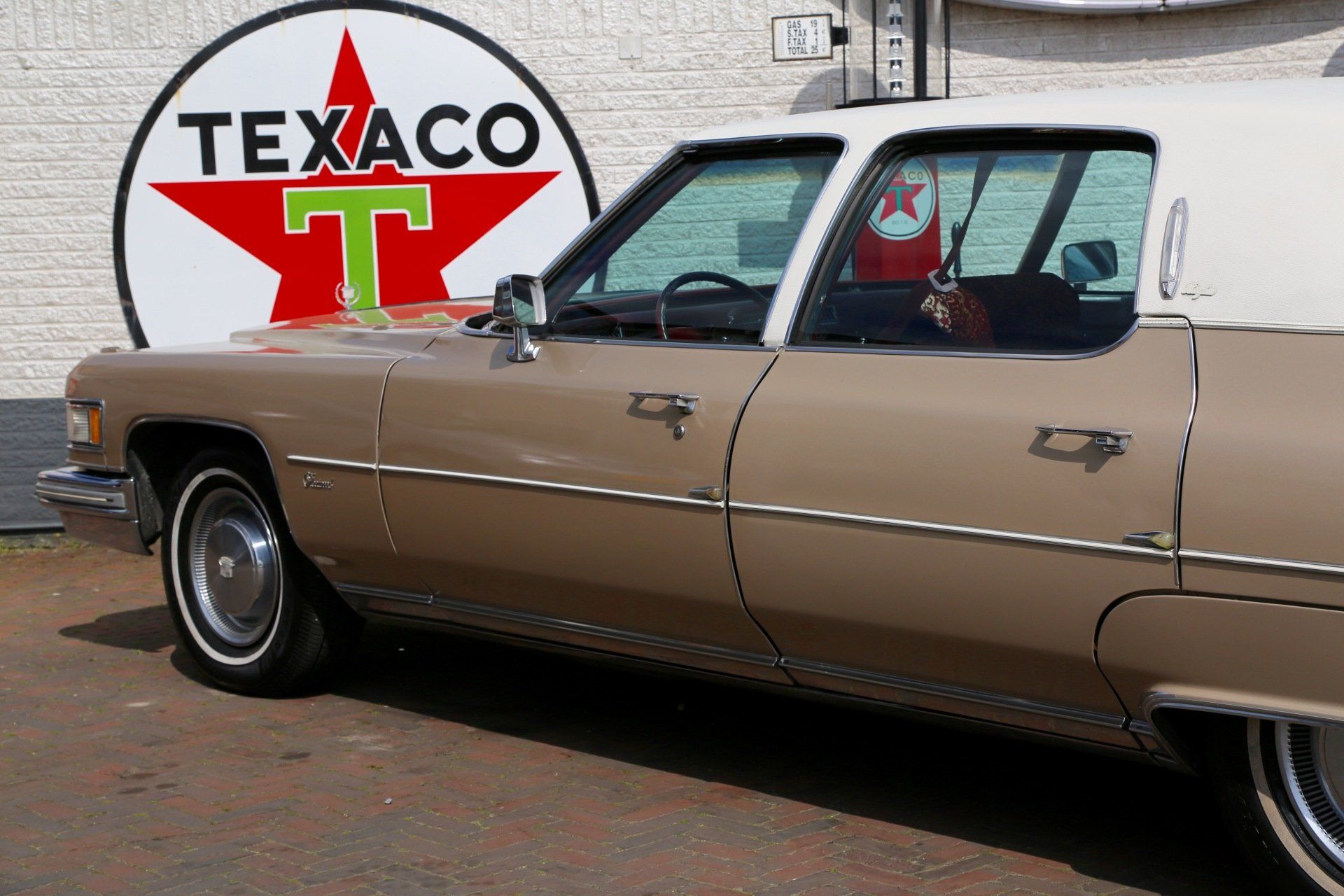 Nee het betreft hier geen tranen trekkende ex begrafenis volgauto, maar een zonnige gouden koets met een fris wit vinyl dak, een echte Amerikaanse slee zoals je ze in de jaren 70 tegen kwam in de USA.