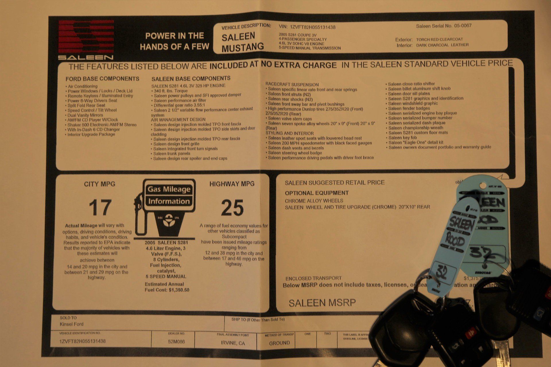 Deze Saleen heeft alles in zich om een belegging voor de toekomst te zijn, daar dit jaar (2005) stond voor de retro look terugkeer na precies 40 jaar van het legendarische model uit 1965. Uit de building records blijkt ook nog eens dat Saleen slechts elf van deze Saleens heeft gebouwd in deze exacte kleurstelling. Door het later toevoegen van nog enkele opties zoals de Thrufiber Venom Hood motorkap, side scoops, speed shifter en Super Charged white stripes is deze Saleen uniek en is er dan ook geen tweede te vinden. Met haar super low 19.287 miles op de teller kan je dan ook verwachten dat hier een pracht exemplaar te koop staat. Deze auto koste nieuw (na transport, invoerrechten, accijns/belastingen) in deze uitvoering bijna 120.000 euro in Europa.