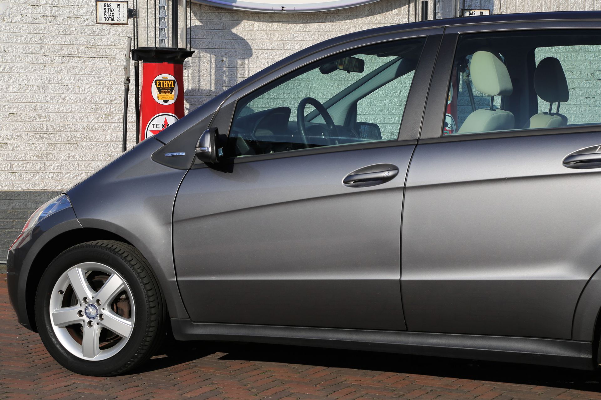 De carrosserie en de buitenspiegels zijn uitgevoerd in de kleur smook grijs-metallic. Het getinte glas zorgt voor extra privacy en houdt uv-stralen buiten. Ook het zachte beige interieur ziet er tiptop uit: het bevat geen gebruikssporen.